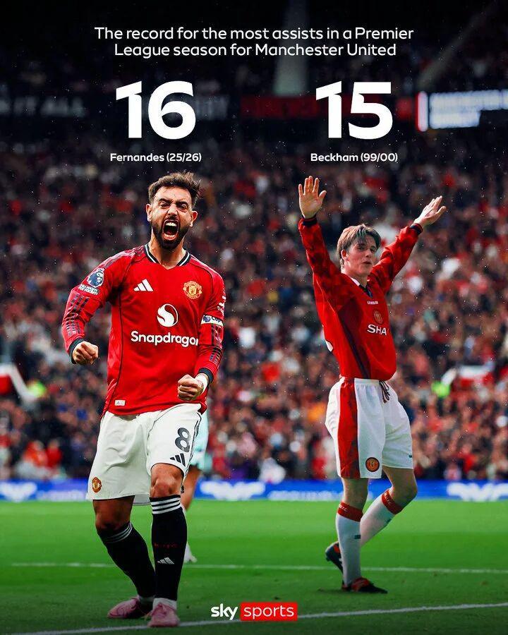 B费2020年加盟至今,已经贡献了105个进球和103次助攻,这一数据使他跻身于俱乐部历史上最伟大的球员之列。对于超越小贝的纪录,B费回应道:「我们所说的是最好的传球手之一(小贝),所以我很高兴破纪录。这不会改变我的真正目标,但能与一名靠传球和传中著称的球员并肩,我感到非常荣幸。」